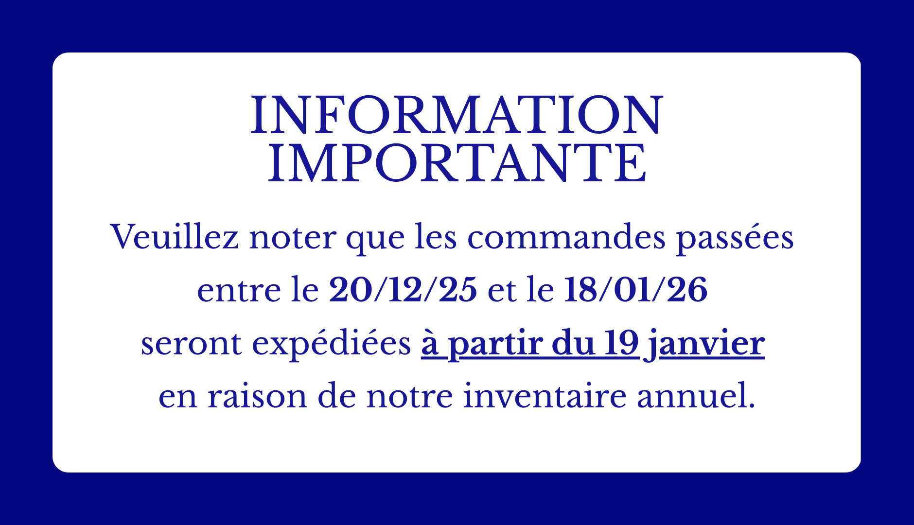 Veuillez noter que les commandes passées entre le 20/12/25 et le 18/01/26 seront expédiées à partir du 19 janvier en raison de notre inventaire annuel.